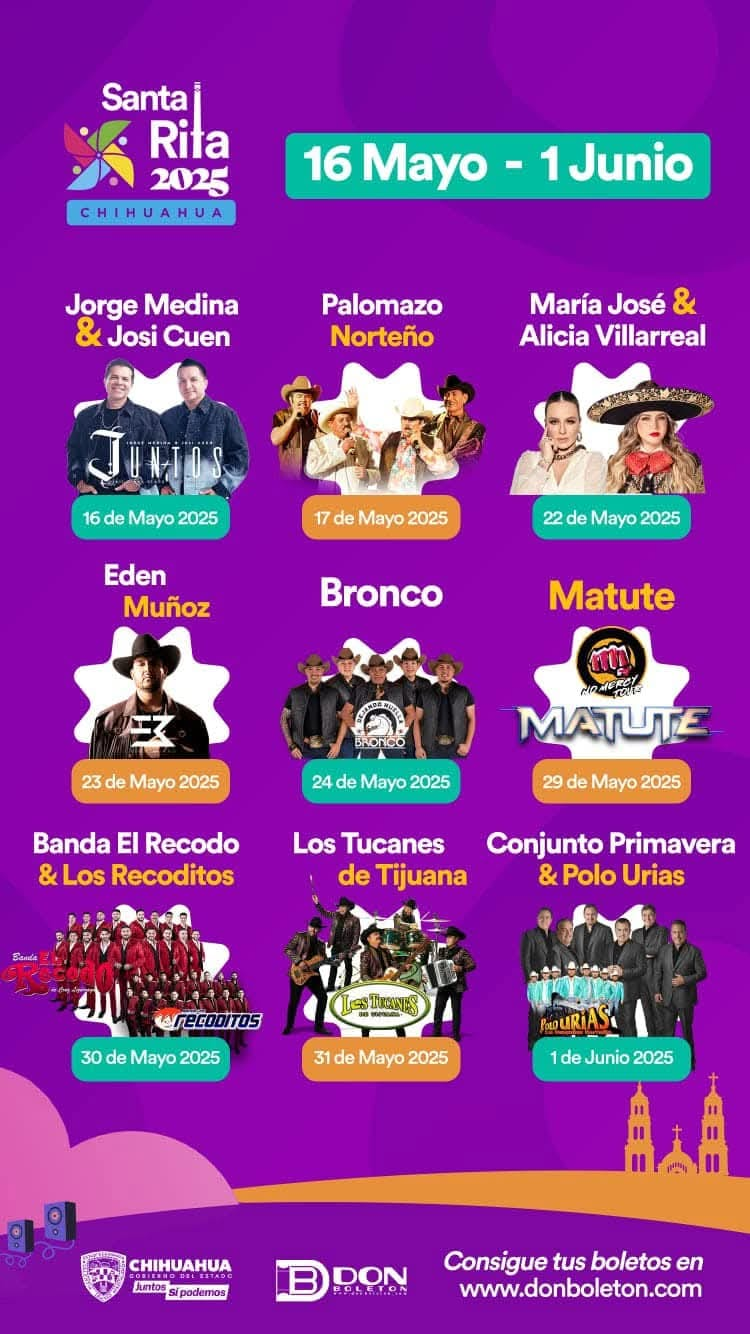 Ya está lista la cartelera artística para el Palenque de la Feria Santa Rita 2025 del 16 de mayo al 1 de junio. Se presentarán artistas y grupos musicales en diversos géneros musicales como Jorge Medina y Josi Cuen, Bronco, Los Tucanes de Tijuana y muchos más. No hay pretexto para quedar fuera de la próxima Feria Santa Rita Chihuahua 2025, ya que con bastante anticipación se ha anunciado el cartel, por lo que habrá tiempo suficiente para adquirir tus boletos para tus artistas preferidos. Cada año, en la ciudad de Chihuahua se presenta su feria anual con grandes atracciones…