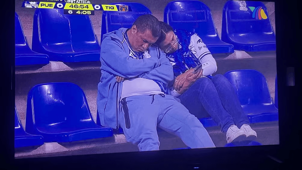 En los últimos minutos, una imagen ha comenzado a viralizarse en redes sociales, capturando la atención de los aficionados al futbol mexicano. Se trata de una fotografía que muestra a dos seguidores profundamente dormidos en las gradas del estadio durante el partido entre Puebla y Tigres, correspondiente al empate 0-0 al medio tiempo.Play Video