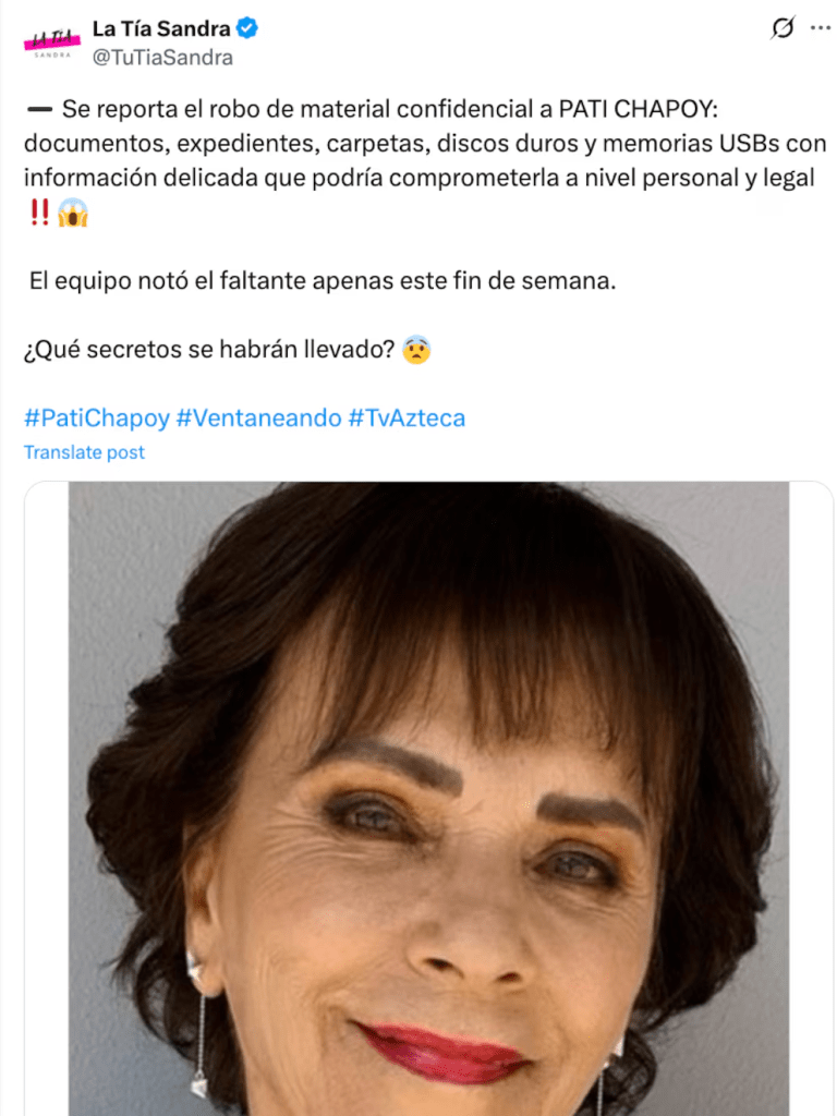 El mundo del espectáculo podría estar al borde de una nueva tormenta mediática. En redes sociales se ha levantado el rumor de que Pati Chapoy, la famosa periodista de TV Azteca, podría haber sido víctima de un robo, no monetario, sino de información sensible.