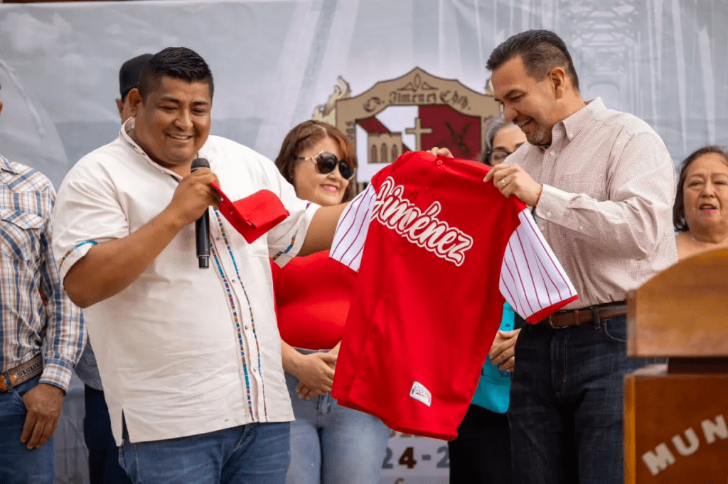 Pérez Cuéllar recibió de manos de su homólogo una jersey y una cachucha de los Rojos de Jiménez.